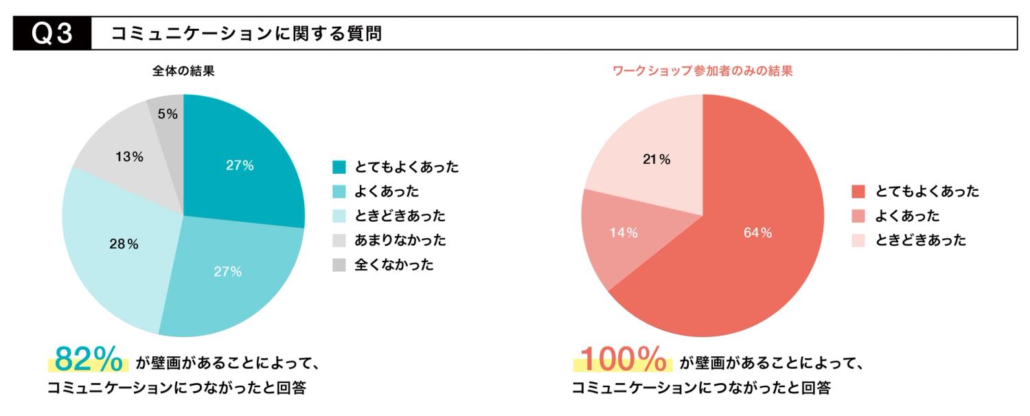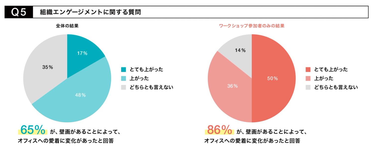 このことから、オフィスにアートを導入することは、対内的・対外的にも組織ブランディングに役立つと言えることが分かります。 さらに、ウォールアートを入れるという取り組みを通して、 「先進的で柔軟な考えたをする組織だという印象に変わった」 「職員の働く環境を考えてくれていると実感した」などと、アートをきっかけに自身が所属する組織にポジティブな印象を持ったという意見が多く寄せられました。